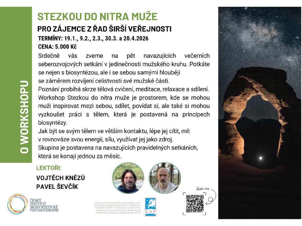 Workshop Stezkou do nitra muže je prostorem, kde se mohou muži inspirovat mezi sebou, sdílet, povídat si, ale také si mohou vyzkoušet práci s tělem, která je postavená na principech biosyntézy.